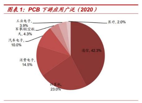 PCB是承載電子元器件并連接電路的橋梁,廣泛應(yīng)用于通信、消費電子、計算機、汽車電子、工業(yè)控制、軍事/航空航天、醫(yī)療器械等領(lǐng)域。PCB在汽車電子中主要應(yīng)用于動力控制系統(tǒng)、安全控制系統(tǒng)、車身電子系統(tǒng)、娛樂通訊四大系統(tǒng),主要有車燈總成、液晶儀表、空調(diào)器、車身傳感器等電子電器零部件。