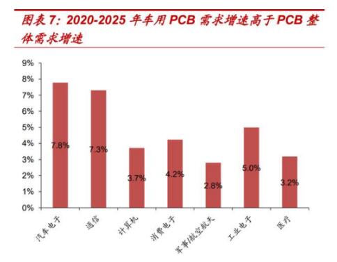根據(jù)Prismark數(shù)據(jù),車用PCB需求將從2020年65億美元提升至2025年的95億美元,CAGR為7.6%,高于PCB 整體增速1.8pct,預(yù)計車用PCB占比將從2020年的10%提升至2025年將為11%。