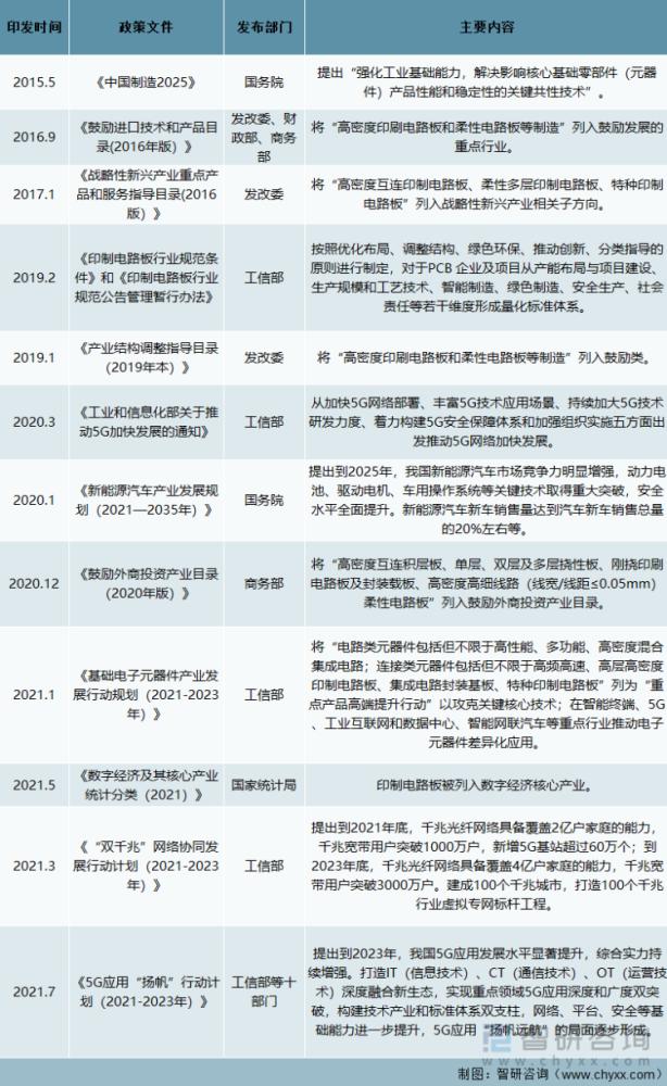 電子信息產業是我國重點發展的戰略性、基礎性和先導性支柱產業,而PCB行業作為電子信息產業發展的基石成為國家鼓勵發展的項目之一。近年來,我國頒布了《鼓勵進口技術和產品目錄(2016年版))、《產業結構調整指導目錄(2019年本)》等政策鼓勵PCB行業發展。此外,還頒布了《新能源汽車產業發展規劃(2021—2035年)》、《“雙千兆”網絡協同發展行動計劃(2021-2023年)》、《5G應用“揚帆”行動計劃(2021-2023年)》等一系列產業政策支持和引導5G通信、新能源汽車等領域的發展,進而促進PCB行業的發展。國家政策的扶持將為PCB產業提供廣闊的發展空間,助力PCB產業轉型升級。
