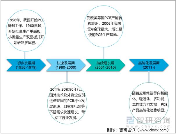 我國PCB產業發展歷程大致可分為初步發展期、快速發展期、持續增長期及高階化發展期四個階段。1956年,我國開始PCB研制工作,隨著國外技術引進、外資企業引進及歐美等國家PCB產能轉移,2006年我國成為全球最大、增長最快的PCB生產基地。隨著應用終端等向智能化、輕薄化、多功能、高性能方向發展,目前我國PCB行業正朝著高階化發展。