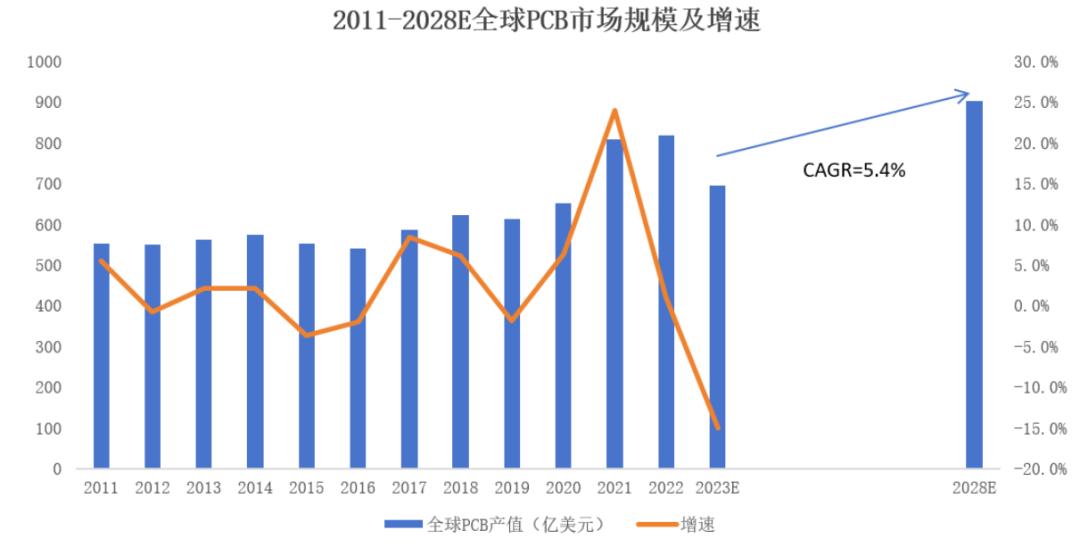 從中長期看,科技是全球經濟發(fā)展的主要動力,與之相關的產業(yè)發(fā)展有望維持較高增速。PCB作為“電子產品之母”,其發(fā)展與電子科技產業(yè)緊密相關。Prismark預計2024年起PCB市場規(guī)模將恢復穩(wěn)定增長,2023年至2028年的復合增長率達到5.4%,2028年將達到904億美元。