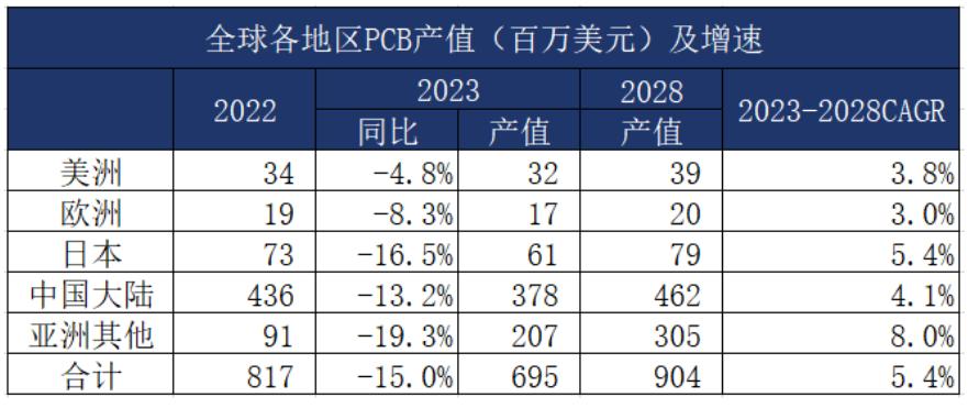 中國仍將繼續(xù)保持行業(yè)的主導制造中心地位,但由于中國PCB行業(yè)的產品結構和一些生產轉移,Prismark預測2023-2028年中國PCB產值復合增長率約為4.1%,略低于全球,預計到2028年中國PCB產值將達到約461.80億美元。