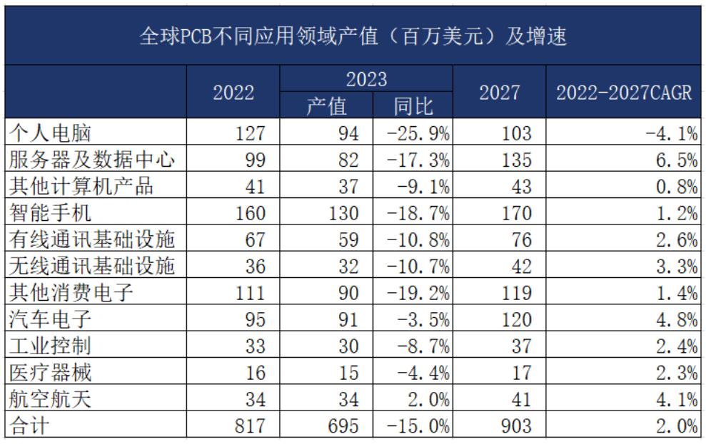 從PCB產業(yè)分下游應用占比來看,根據Prismark數據,智能手機、個人電腦、其他消費電子、汽車電子、服務器及數據中心是PCB下游中的核心應用場景,其中服務器及數據中心、汽車電子成長最快,預計2022年至2027年CAGR分別達到6.5%、4.8%,是推動PCB行業(yè)新一輪快速 增長的主要驅動力。