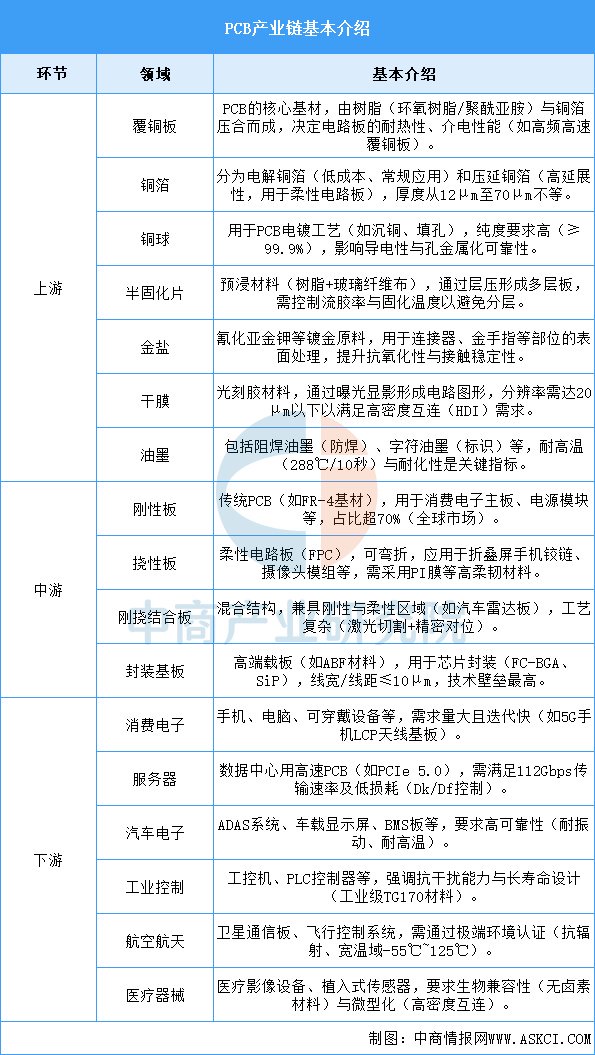 PCB產業鏈上游為原材料,包括覆銅板、銅箔、銅球、半固化片、金鹽、干膜、油墨等;中游為PCB的制造,可分為剛性板、撓性板、剛撓結合板、封裝基板等;下游廣泛應用于消費電子、服務器、汽車電子、工業控制、航空航天、醫療器械等領域。