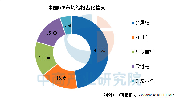 目前,我國多層板占比超過四成,占比達47.6%。其次,HDI板在市場中也占據了一席之地,占比約為16.6%。其次分別為單雙面板、柔性板、封裝基板,占比分別為15.5%、15.0%、5.3%。