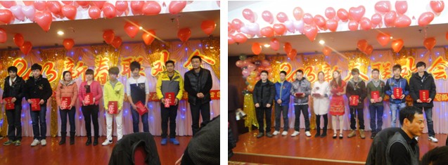 16:20,一場屬于萬正人的2013年新春聯歡會正式拉開序幕。主持人沈曉麗、鄧健的亮相之后,現場的氣氛愈加熱烈。本次新春聯歡會共分為四個環節,即領導賀詞、年度表彰、幸運抽獎、新春年夜飯。首先,副總經理王德瑜為全體萬正人送上了新一年的賀詞。他一再強調,正是全體萬正人團結協作、積極進取的優良傳統和鍥而不舍的拼搏精神使公司迎難而上,勇克困難,為2012工作劃上了圓滿句號。同時,他指出,2013年公司將以“加快管理提升,提高質量效益”為目標,要在管理提升、績效執行、持續改進、建好隊伍四個方面實現新的飛躍。王總振奮人心的賀詞讓大家內心澎湃,士氣大振。現場的喝彩聲、掌聲絡繹不絕。