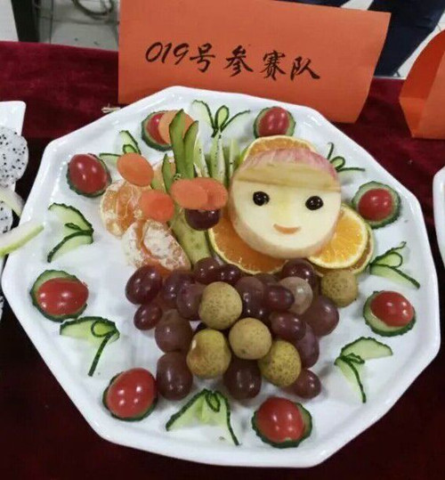 我們的小組成員有:向杉杉、王瑞、陳夢佳、崔琳琳以及我,我們的小組名字:沐年之夏,不知道當時為什么取這個名字,大概是覺得炎炎夏季的尾聲即是迎接秋季的收獲吧,春天是播種是開始,夏季是炙烤是堅持是歷練,不然怎會有秋天的碩果累累。當然比賽之前我們也是做過準備的,作品以蘋果做的笑臉為主,其它的葡萄、橘子、西瓜、哈密瓜、胡蘿卜、圣女果等切粒擺放,用黃瓜切片做成蝴蝶狀圍邊,整個作品透露出青春、奮斗和希望,特別是雕成笑臉的蘋果,寓意著時時刻刻笑著面對生活、面對挫折和困難,不斷的提高自己。作品的名字:花樣青春,這就是我們90后人生觀,是我們面對生活、社會的態度,是我們最最別致的花樣青春。