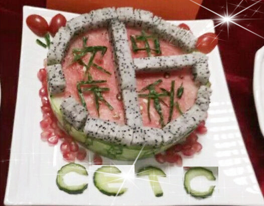 利用我們前期所想的水果材料,創(chuàng)意拼盤開始了,我們一致采用了隊(duì)員宋次秋的想法:愛廠如愛家,以“萬(wàn)正是我家”的理念,把自己融入到大家庭中來(lái),為公司獻(xiàn)上一份特別的禮物。于是,我們開始制作萬(wàn)正Logo 圖標(biāo),并寫上中秋佳節(jié)祝福語(yǔ),“歡慶中秋”字樣。首先,我們先用刀截取了一層西瓜做為圖標(biāo)的外形,然后,再采用火龍果做為圖標(biāo)的造型設(shè)計(jì),接著采用黃瓜皮拼出“歡慶中秋”四個(gè)字,再圍繞著圖標(biāo)用石榴包圍一圈,最后放上英文字目“CCTE中國(guó)制造”四個(gè)英文字目。瞬間,我們的作品《萬(wàn)正之家》誕生了,真美!