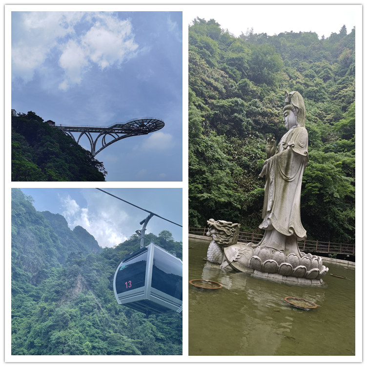 午餐后,轉場到了“浙北小九寨”——安吉靈溪山,景區坐落在群山疊嶂的峽谷中,主峰凌霄峰海拔1169.6米,坐擁豐富生態資源的森林氧吧,造就了“浙北新秀,畫里靈溪”的獨特美域。驗票進入景區,首先,走過1500米的觀音水景廣場,內有一尊10多米高寶相莊嚴的觀世音菩薩,四周供奉著32尊栩栩如生的觀音化身,供游客燒香敬奉。其次,領略了不一樣的靈溪風景,體驗了騰云駕霧般的靈溪纜車,總長985米,垂直落差288米,全程共10分鐘。