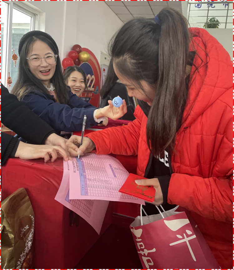 為保證抽獎環節有序順利進行,特邀請公司各個部門派代表作為工作人員。現場由葉秀華、沈靜南和宋飛作為活動總控;杭沈圓負責新年音樂播放;李秋艷、凌瑋現場拍照;金全紅引導“新年送福區”現場員工查找、簽名;陳建群搖獎箱管理;陳夢瑤紅包發放;孟佳“新年獎品區”搖獎箱管理;周青、倉瑋獎品發放;戴秀青、俞悅、張雪梅、丁蘭、秦小紅、王蓉“福袋區”發放伴手禮。