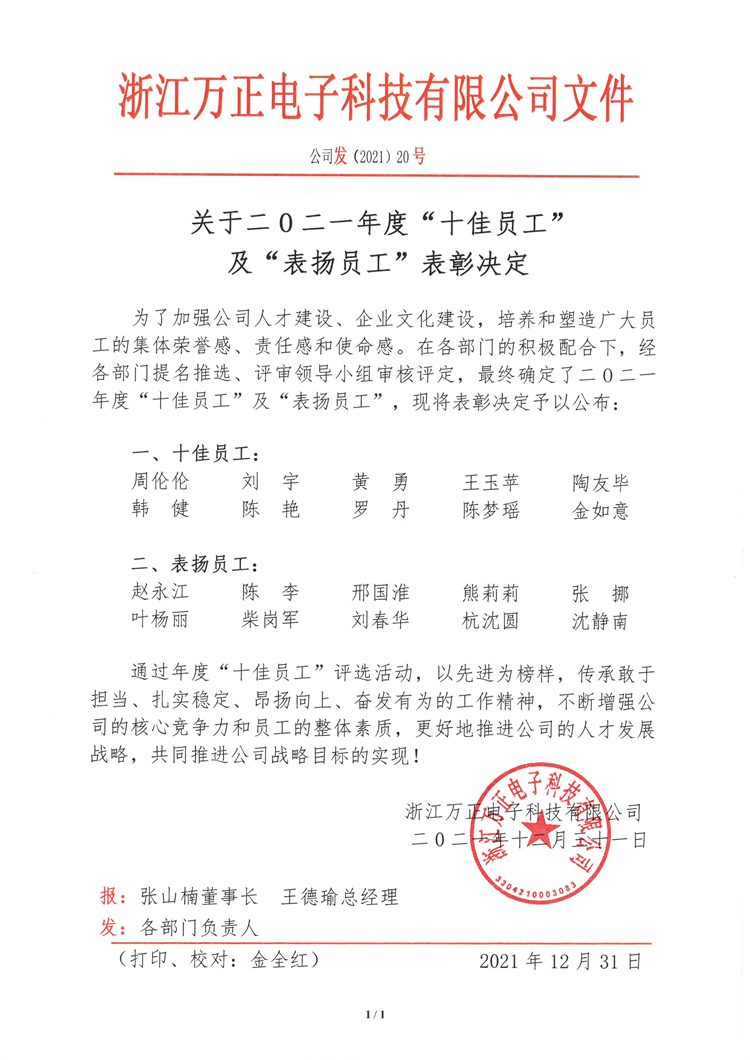 關于二O二一年度“十佳員工”及“表揚員工”表彰決定