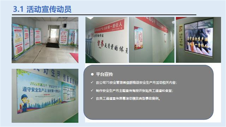 本次安全月活動(dòng)中,安環(huán)部圍繞安全月主題策劃了多項(xiàng)活動(dòng),制作安全月宣傳海報(bào)張貼,通過微信平臺(tái)推送安全月活動(dòng)相關(guān)內(nèi)容,在員工通道大屏上滾動(dòng)播放典型事故案例,組織重點(diǎn)崗位人員參加百萬員工大培訓(xùn)線上線下學(xué)習(xí),組織全員下載鏈工寶參加“新安法知多少”全國(guó)安全生產(chǎn)月知識(shí)競(jìng)賽活動(dòng),組織全員參與安全隱患排查活動(dòng)、組織內(nèi)部員工安全知識(shí)競(jìng)賽活動(dòng)、開展“我為安全獻(xiàn)一計(jì)”活動(dòng)和化學(xué)品應(yīng)急救援演練等,并為活動(dòng)準(zhǔn)備了豐富的獎(jiǎng)品。