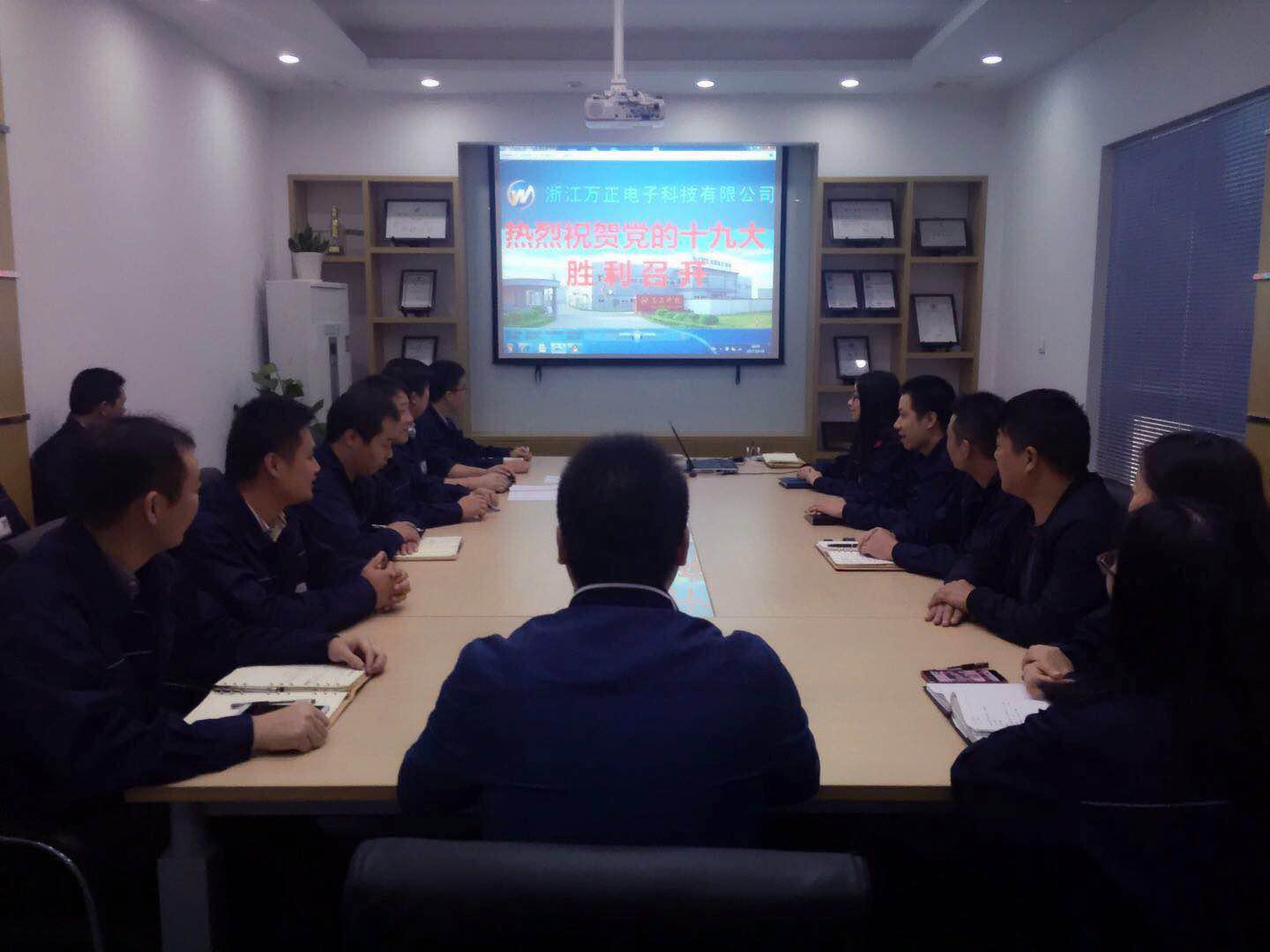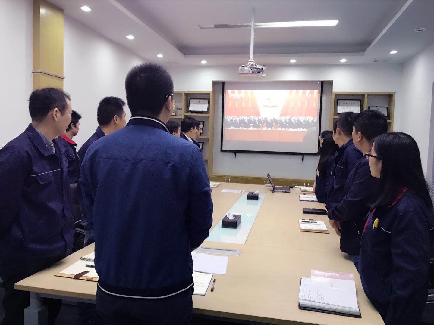 2017年10月18日早上09:00,浙江萬正、九通黨支部黨員陸續來到會議室觀看中國共產黨員第十九次代表大會開幕會。莊嚴的國歌聲響起,全體起立,唱響《義勇軍進行曲》;隨后又向老一輩國家領導人致敬默哀。在聽取習主席代表十八屆中央委員會作報告的過程中,掌聲不斷,實在難掩大家內心的激動:因為我們是共產黨員,新時代的共產黨員!