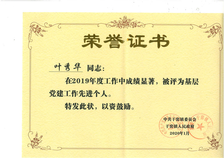 熱烈祝賀公司葉秀華同志被中共干窯鎮(zhèn)委員會授予2019年度“基層黨建工作先進個人”光榮稱號