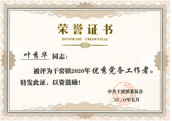 熱烈祝賀公司葉秀華同志被中共干窯鎮委員會授予2020年度“優秀黨務工作者“光榮稱號
