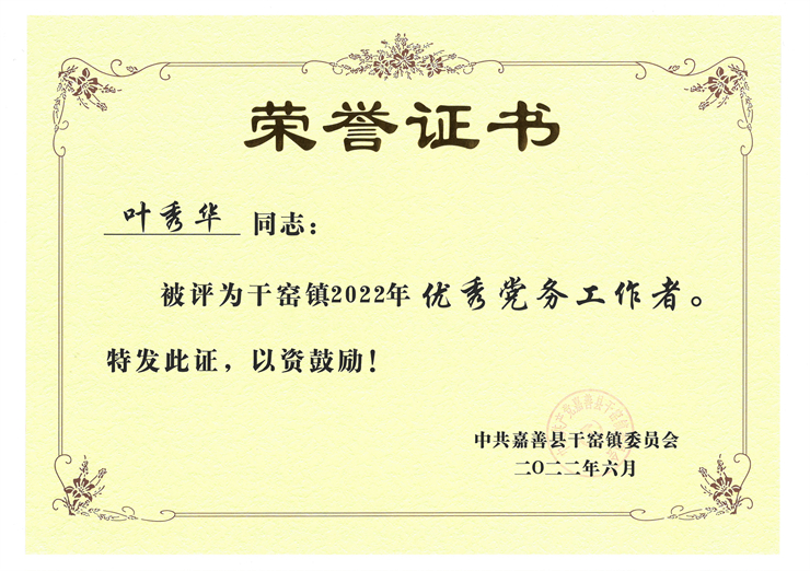 熱烈祝賀公司葉秀華同志榮獲干窯鎮2022年“優秀黨務工作者”